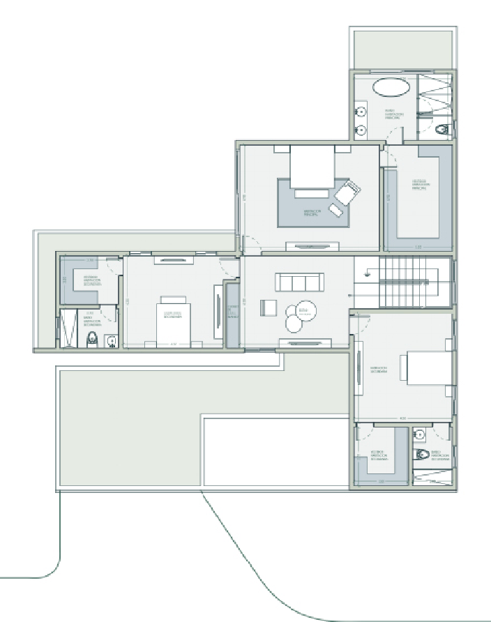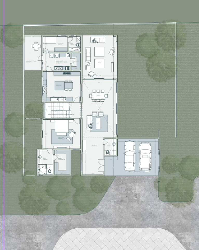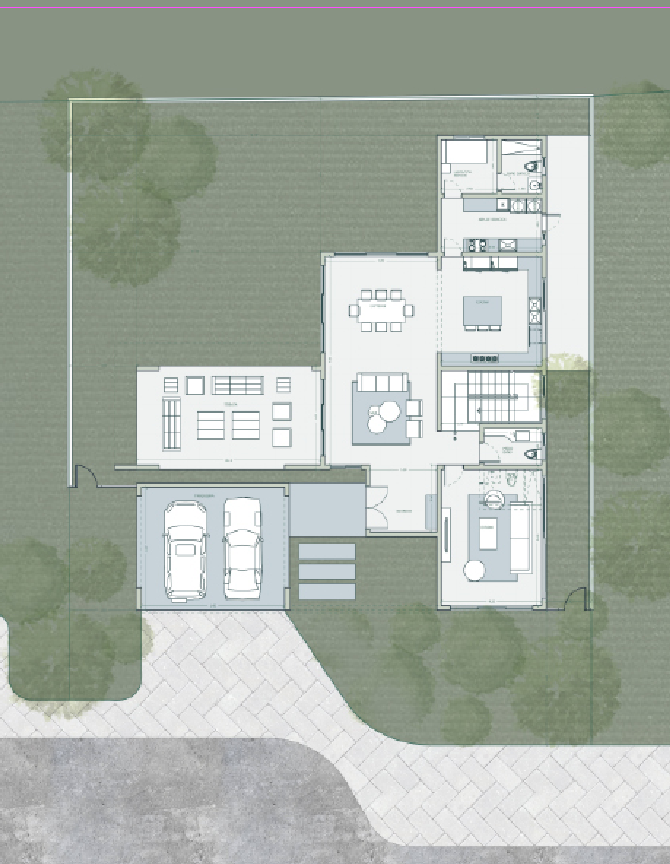 Una vivienda que conecta con la naturaleza en todos sus espacios. Una entrada frontal oculta que crea misterio en las fachadas y luego descubre espacios amplios e integrados que se conectan con gracia con el patio trasero.