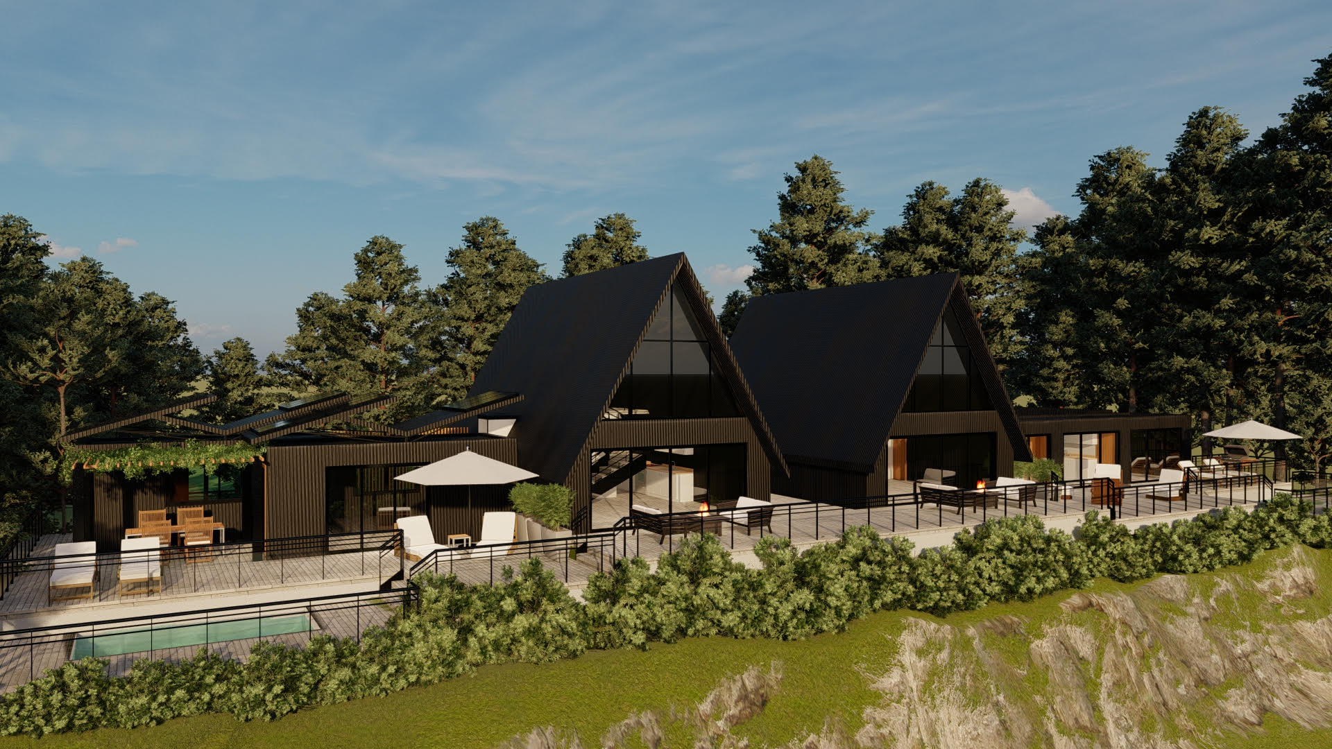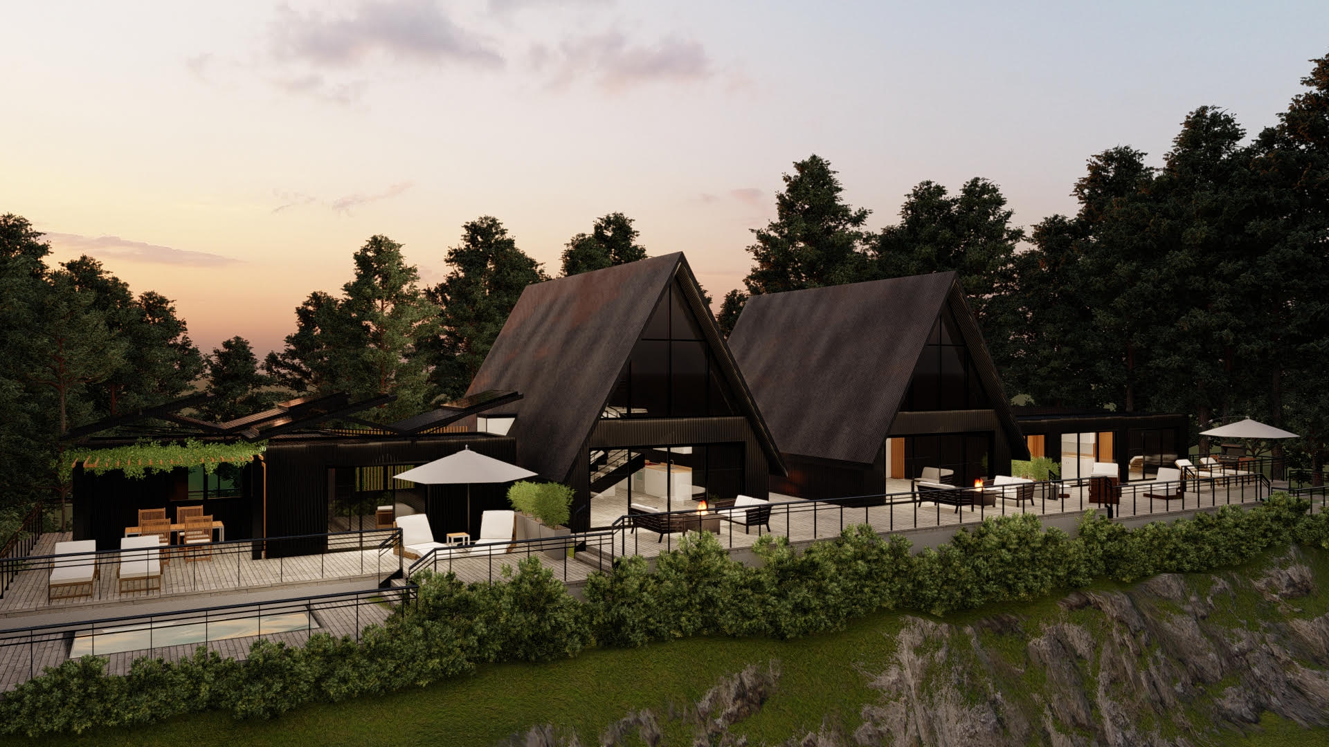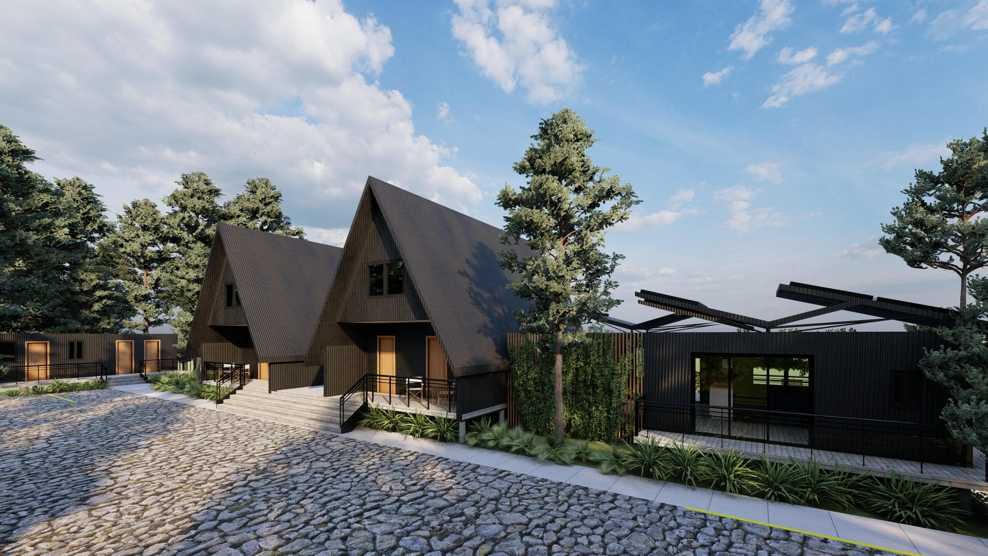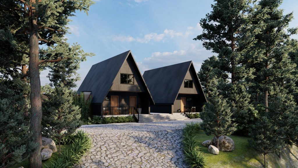 Son 2 casas de dos aguas o ahora nominadas A frame, con una superficie menor de 40 metros cuadrados, pensadas para el descanso o como una forma más simple y económica de vivir.
