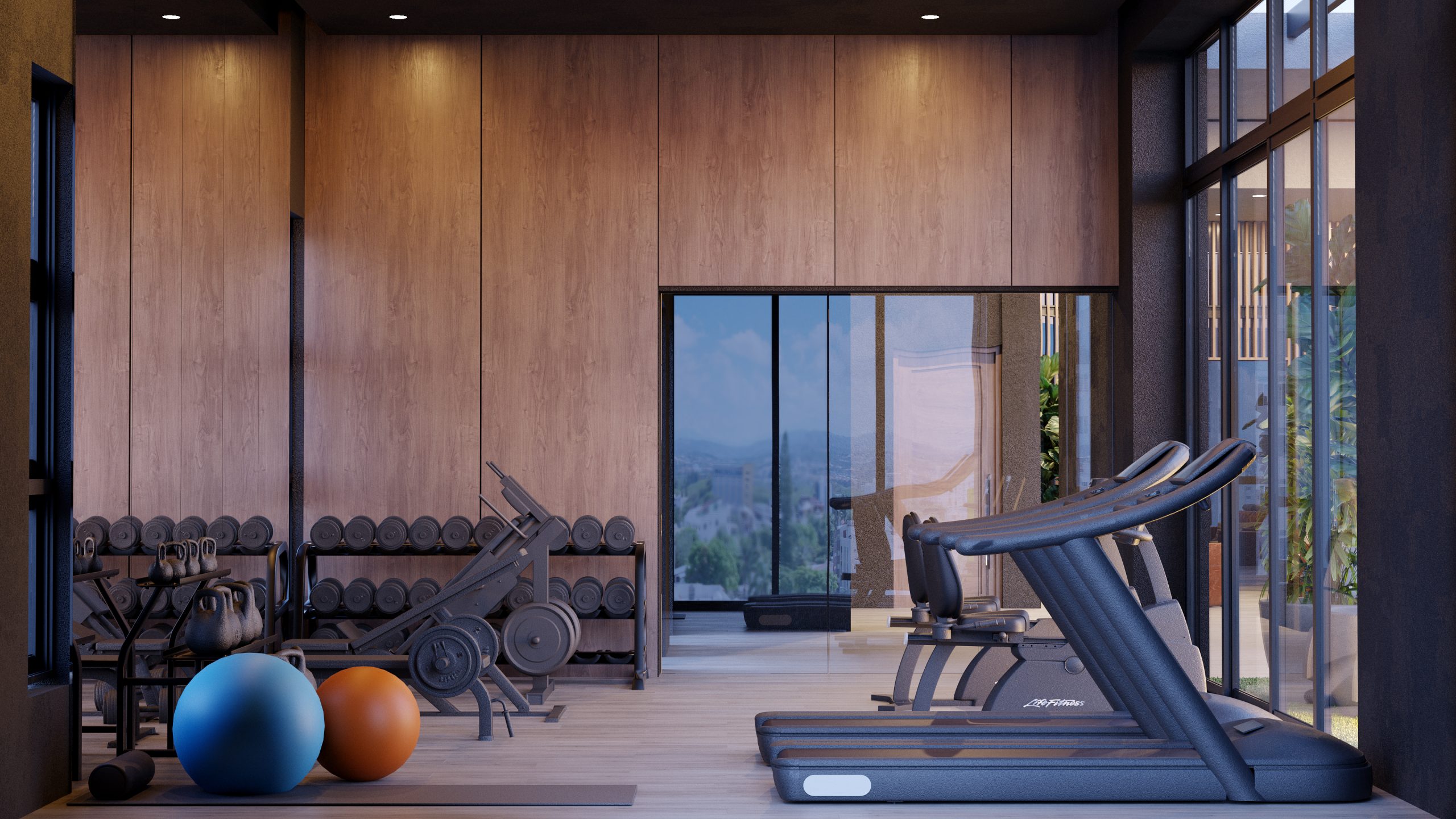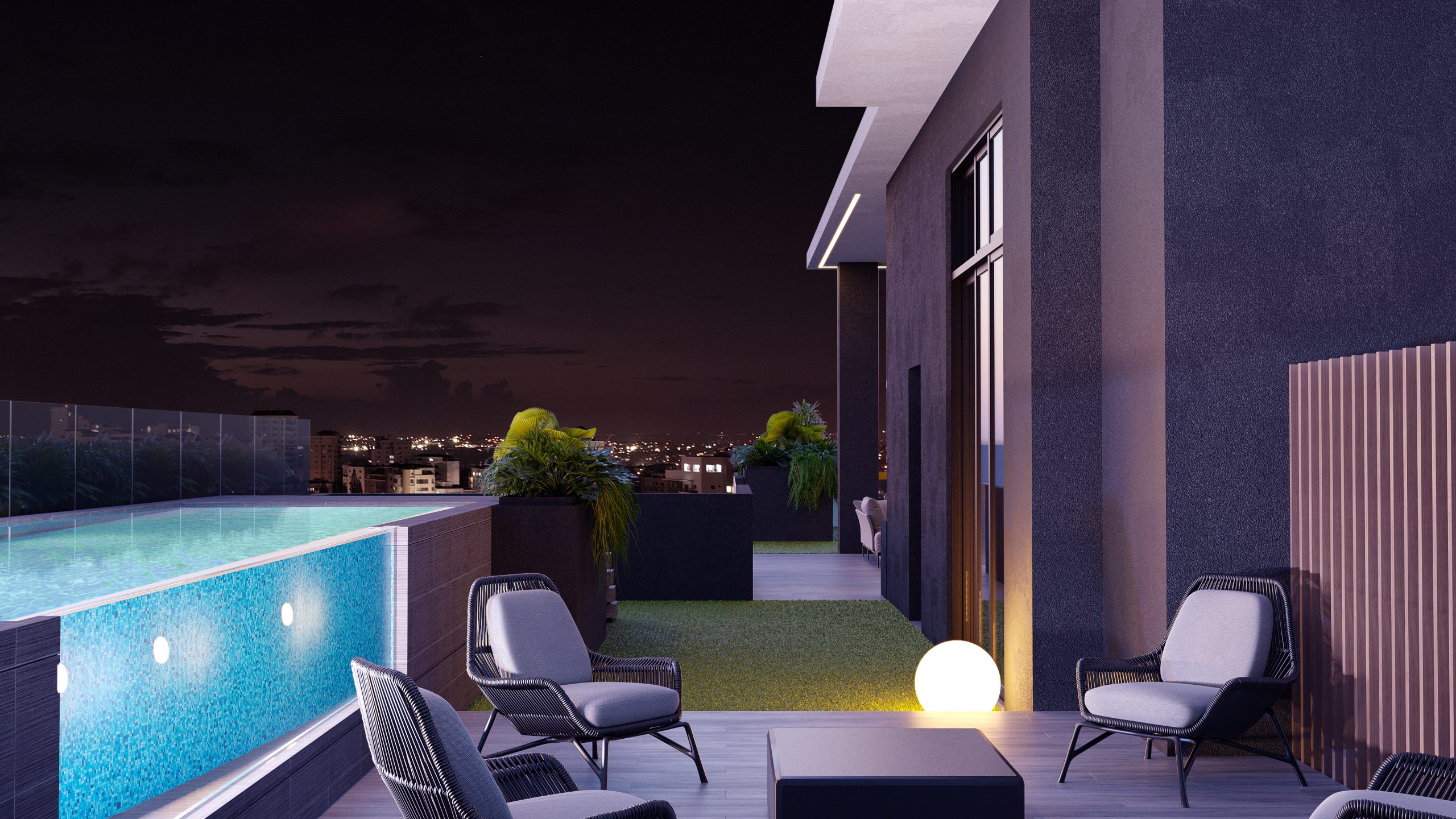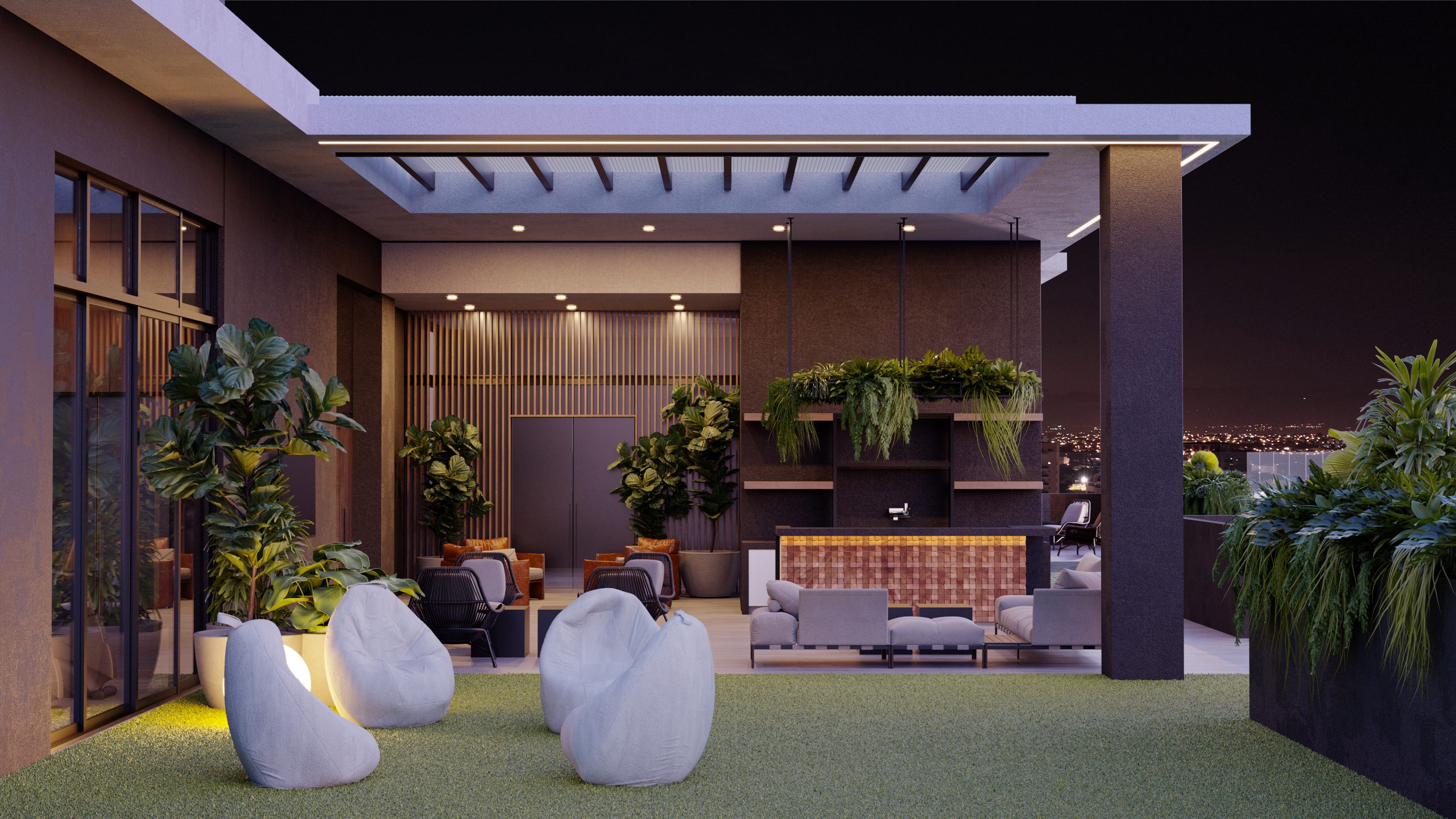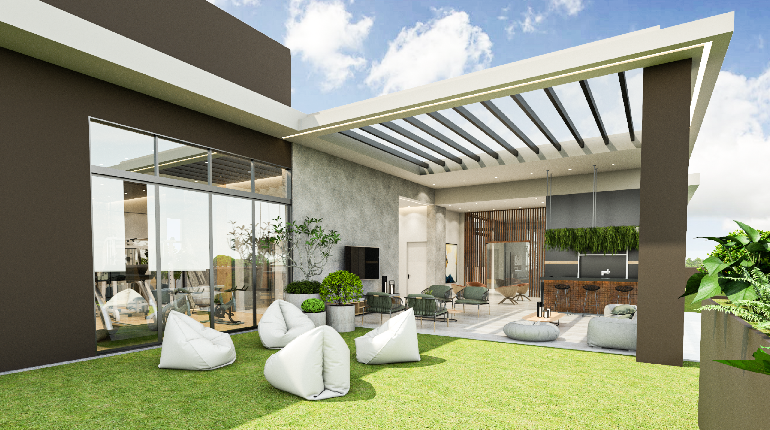 Estos espacios lo tenemos conceptualizados en área de bienestar, donde tenemos el espacio de ejercitarnos tanto al interior en el gimnasio como al exterior en un espacio dual de áreas verdes, cuenta también con un área de zonas húmedas, donde incluimos un picuzzi. Nuestro ambiente social, disfrutará de una gran área de terraza con kitchen/bar integrado y un estudio o salón de usos múltiples para actividad exclusiva para los residentes.